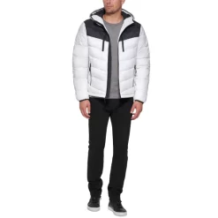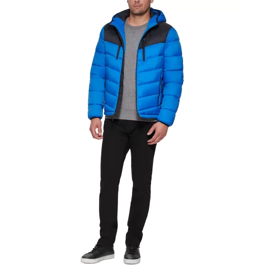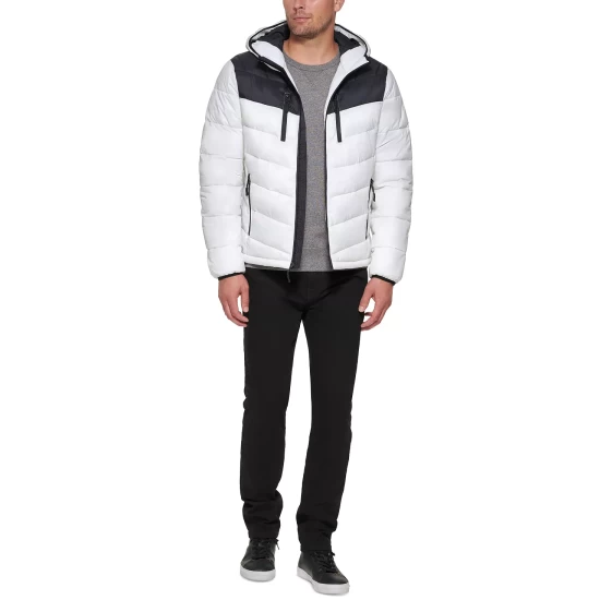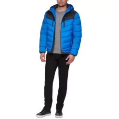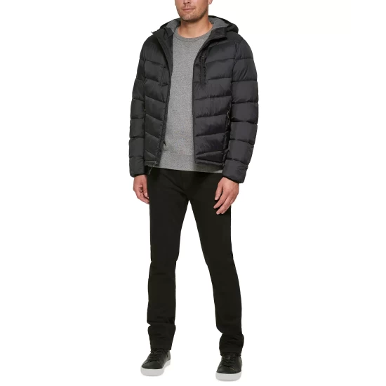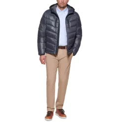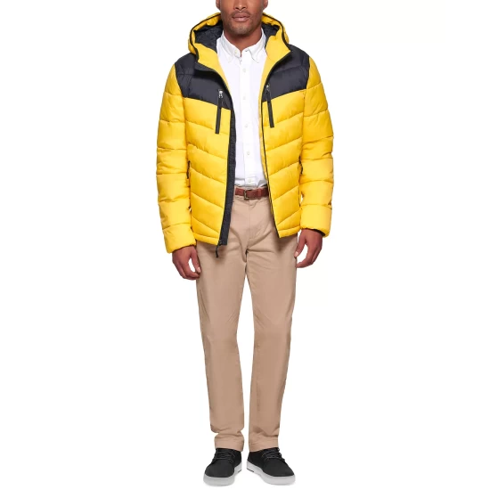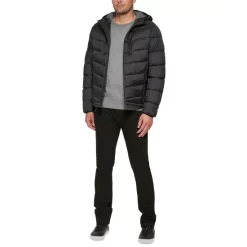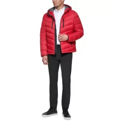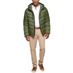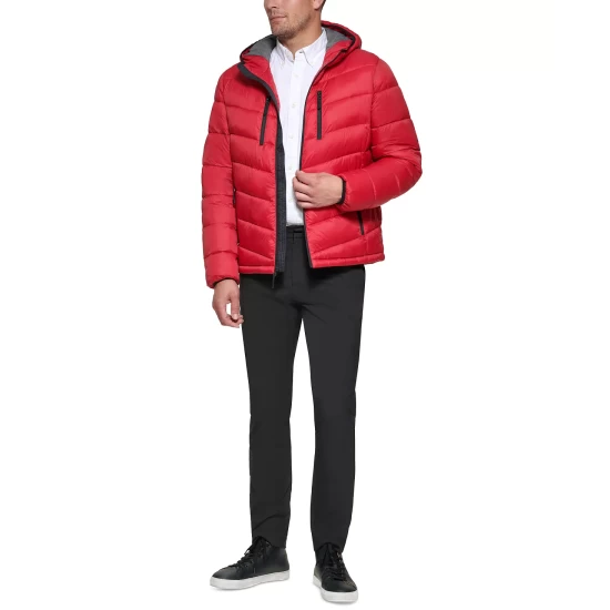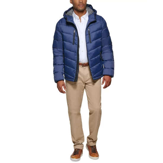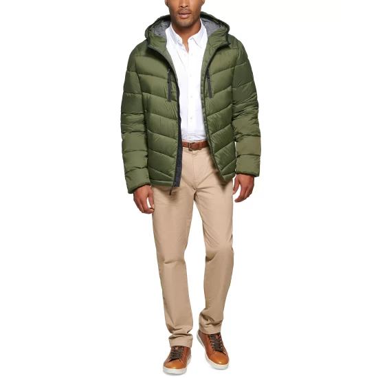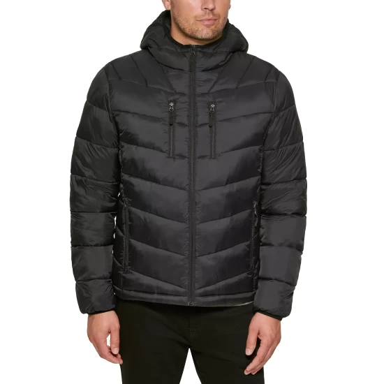 Stay stylish and warm for colder weather with the cozy chevron-quilted styling of this hooded puffer jacket from Club Room.