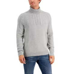 Exude a classic, seafaring look with the ribbed turtleneck and textural cable knit pattern of this handsome cotton sweater by Club Room.