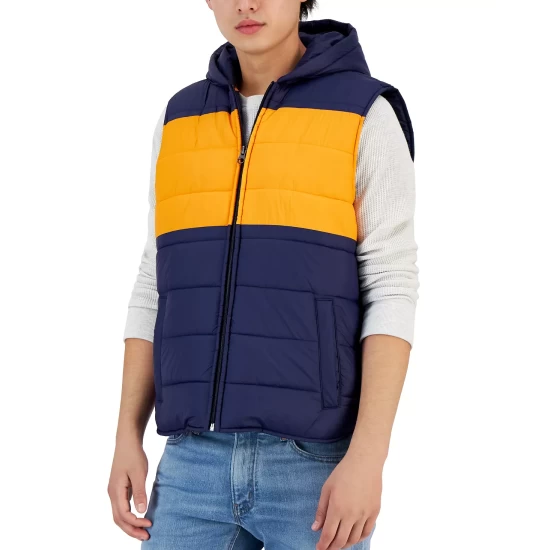 Men’s Colorblocked Puffer Vest adds elevated style to cold weather days, designed with an attached hood and front-zip closure.