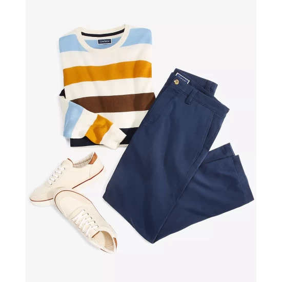 A top with a banded series of joyous, color-rich stripes and a super-soft feel combines with solid four-way stretch pants to offer the utmost in comfort and classic, layer-ready design on this combo from Club Room.