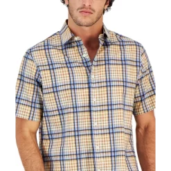 In soft cotton and with an updated plaid patterning, this Club Room short-sleeve button-up shirt offers both luxe comfort and a classic look.