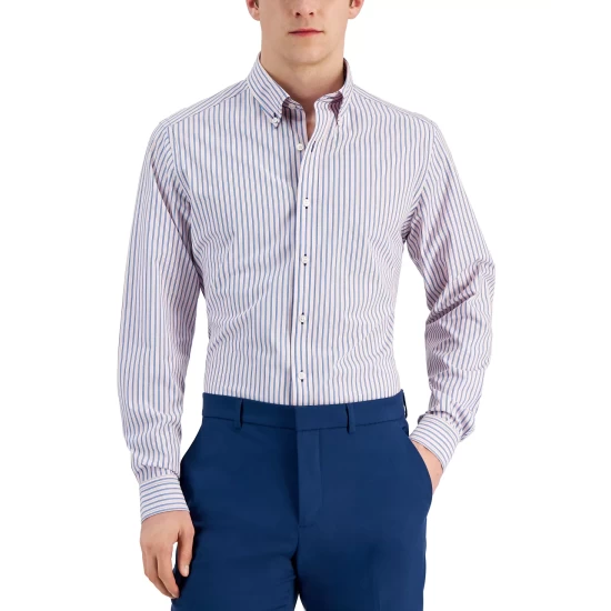Cut from four-way stretch fabric that moves with you every step of the way, Club Room’s dynamic slim-fit stripe dress shirt can be worn tucked or untucked to help you nail the vibe at your next event.