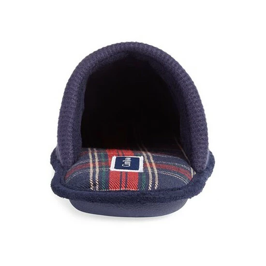 - Slip on; embroidered text at vamp; waffle-knit styling; plaid footbed